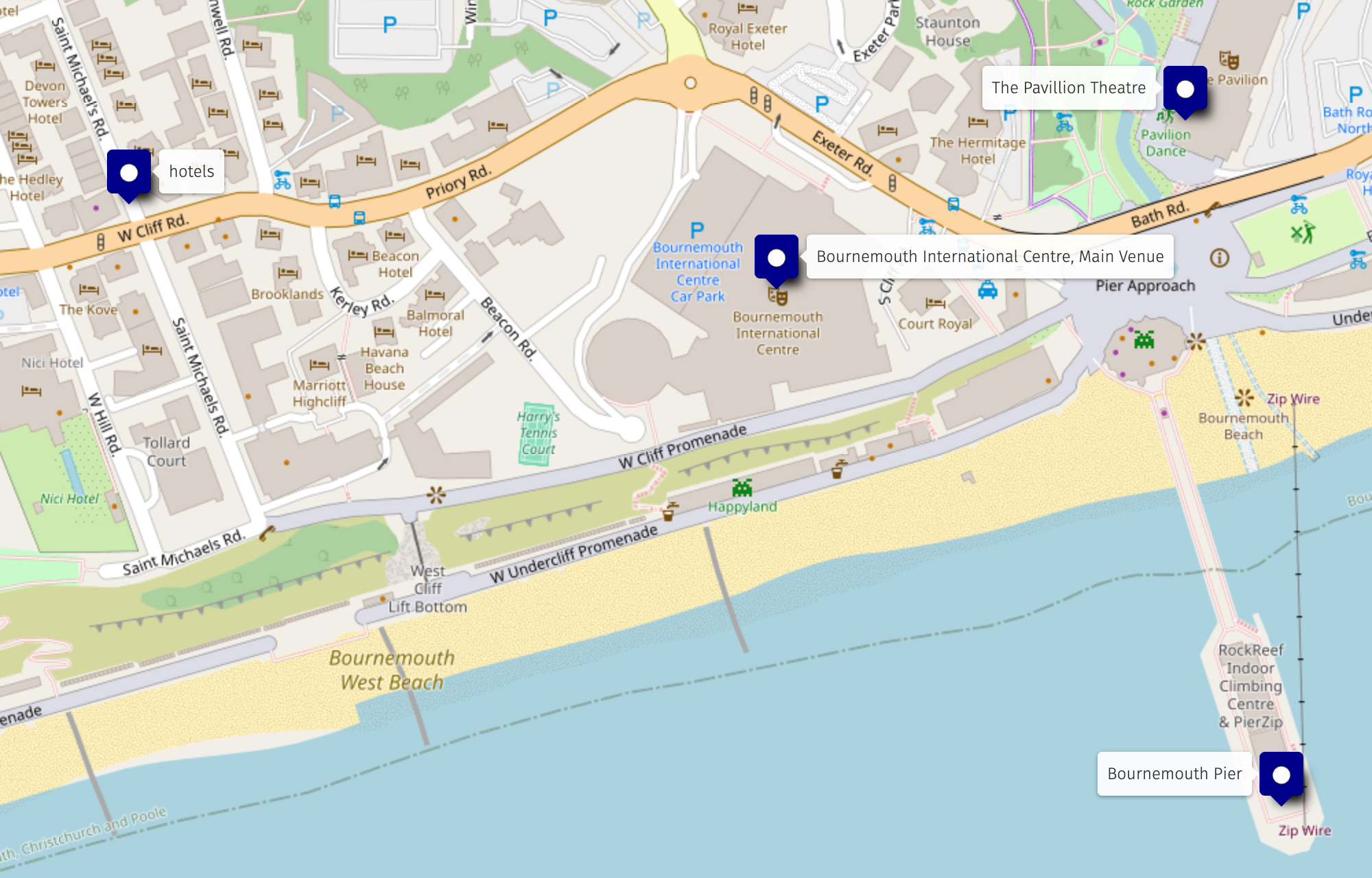 The main conference venue is the Bournemouth International Centre . It offers several conference rooms, some of which faceing the sea.